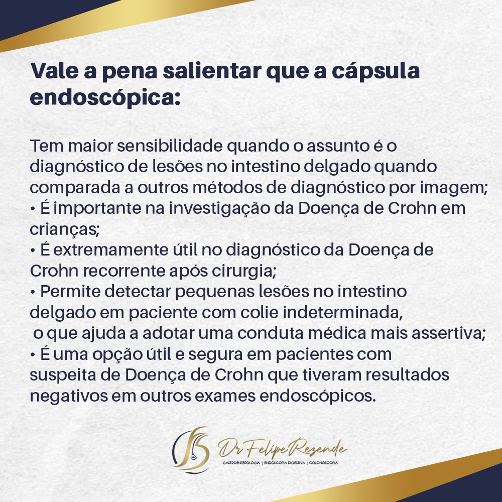 - Possibilidade de visualização de partes do intestino delgado e do tubo digestivo que são difíceis de serem acessadas durante a endoscopia ou colonoscopia convencionais.