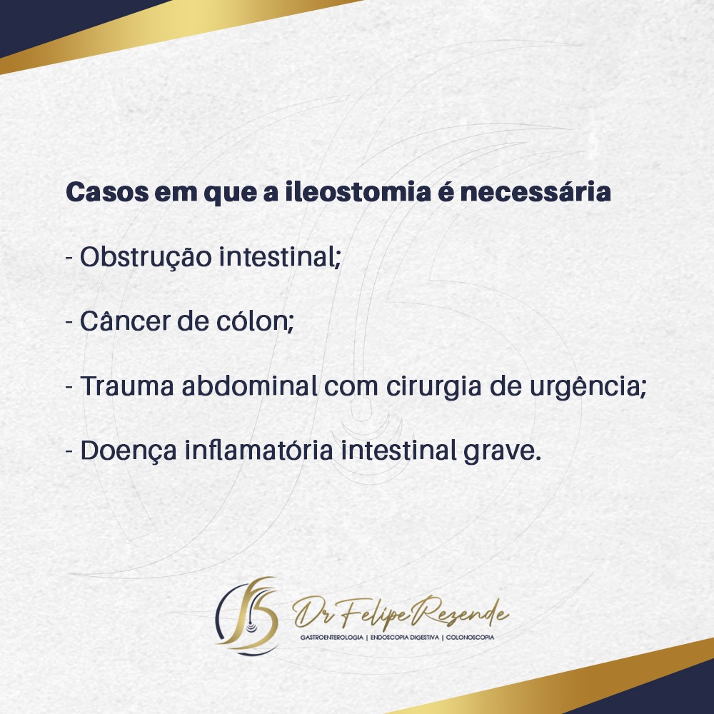 Esse é um procedimento indicado quando o intestino é afetado por alguma doença, e seu objetivo é fazer com que as fezes e gases sejam eliminados por um bolsa, não sendo necessário passar pelo intestino grosso.