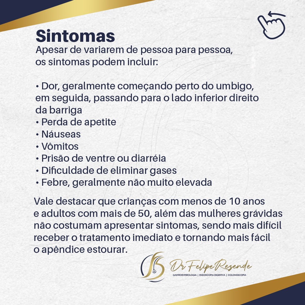 Nas imagens ao lado você confere um pouco mais sobre os sintomas, diagnóstico e tratamento da apendicite!