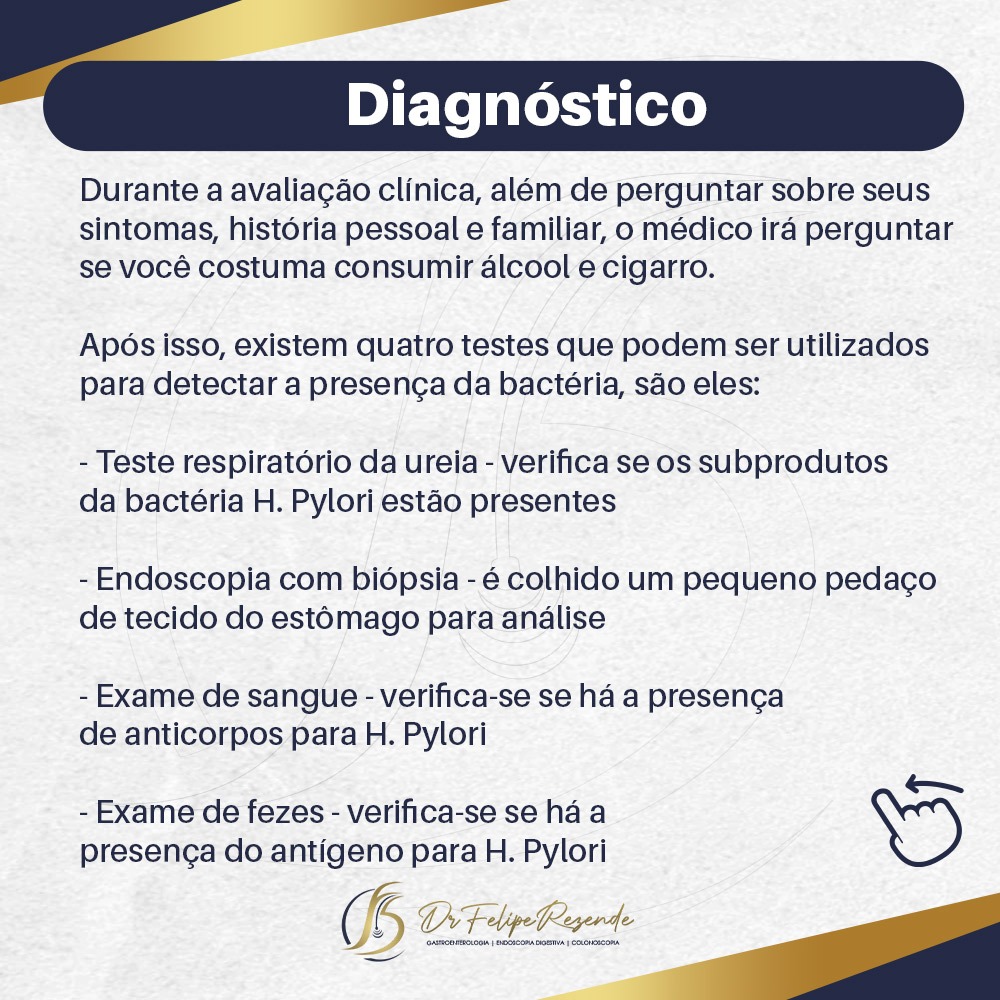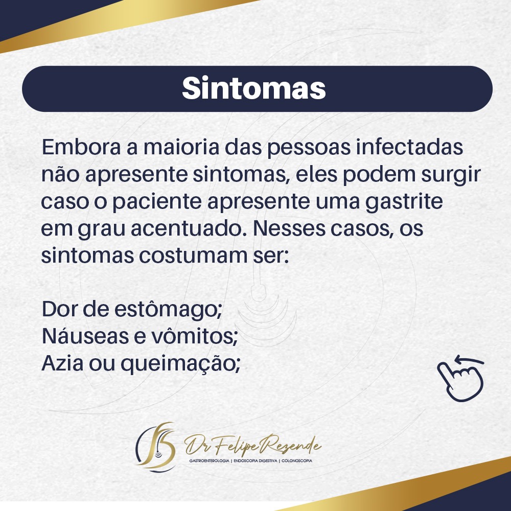 O H. pylori é uma bactéria que pode causar irritação no estômago, úlceras no estômago e/ou duodeno e, até mesmo, ser um fator de risco para o câncer de estômago. Porém, vale a pena salientar que, a maioria das pessoas acometidas pela bactéria não costumam desenvolver úlceras, câncer ou até mesmo sintomas.