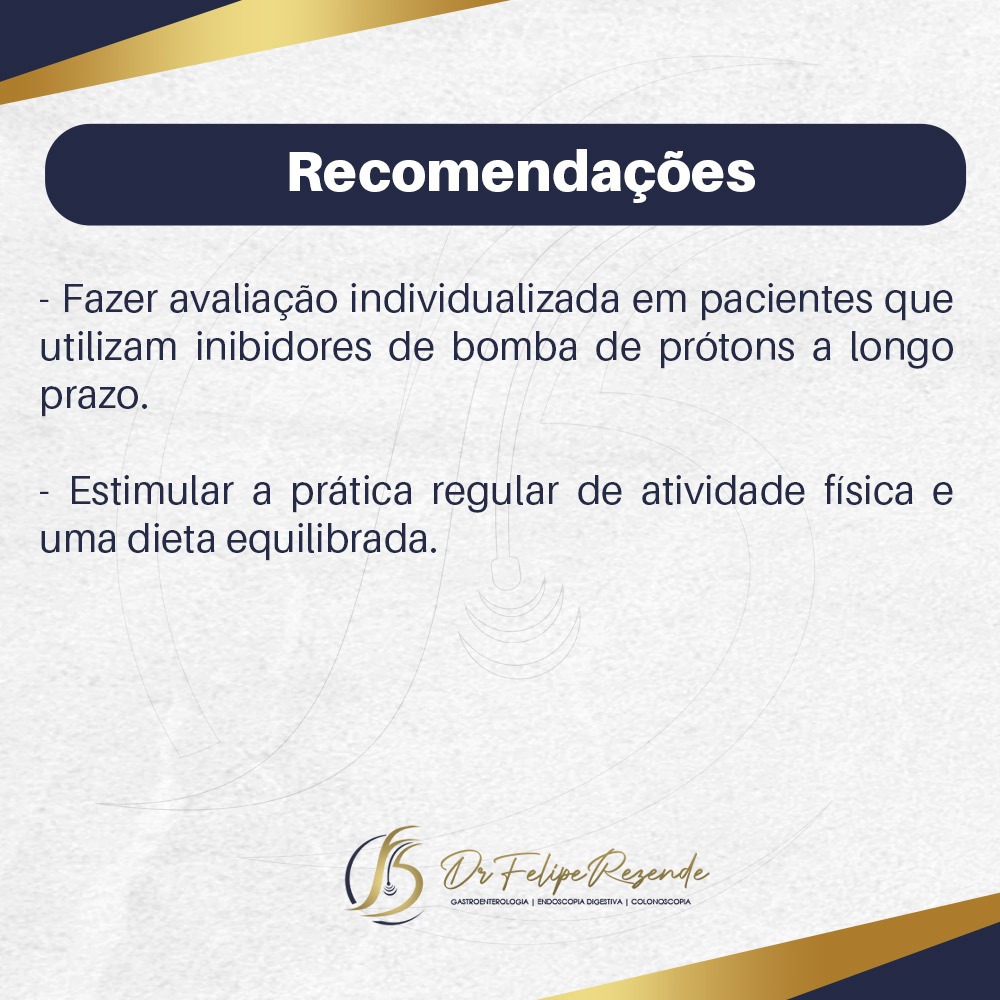 A relação entre o uso prolongado de inibidores de bomba de prótons (IBPs) e o aumento do risco de desenvolver osteoporose se tornou um motivo de preocupação nos últimos tempos. Uma revisão sistemática publicada no Journal of Clinical Endocrinology & Metabolism em 2019 analisou 13 estudos observacionais e concluiu que o uso de IBPs está ligado um pouco aumentado de fraturas ósseas quando comparados com pessoas que não fazem uso desses medicamentos, especialmente quando são utilizados em doses mais altas ou em longo prazo.