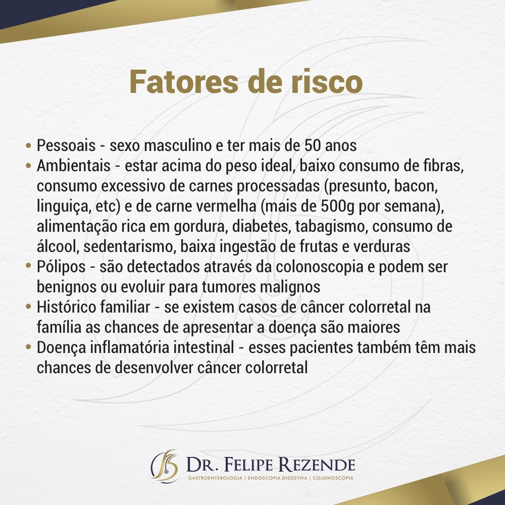 O câncer colorretal é uma doença que não costuma apresentar sintomas nos estágios iniciais, sendo assim, é essencial realizar fazer exames de rastreio caso a pessoa se encaixe em algum dos fatores de risco para a doença.