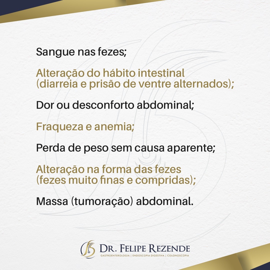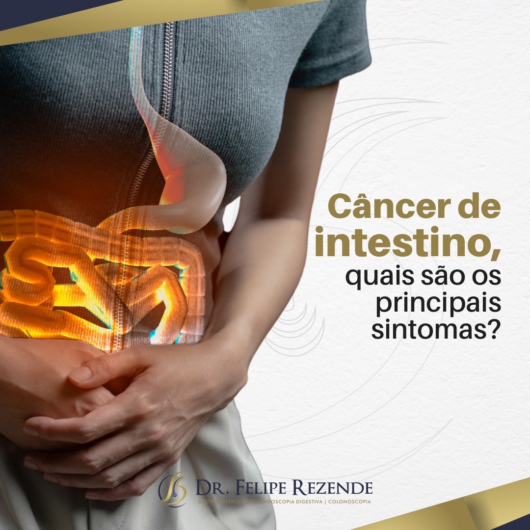 Na próxima imagem você confere quais são os principais sintomas apresentados quando o assunto é o câncer de intestino.