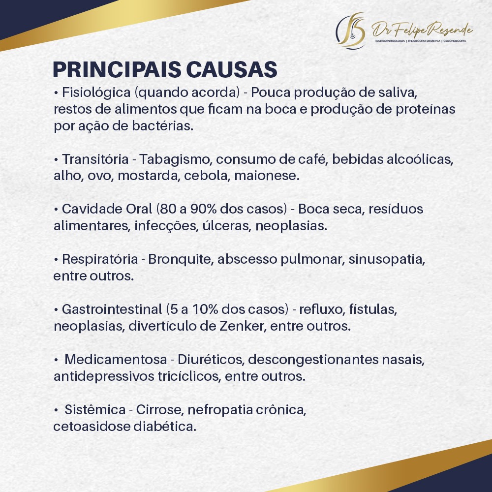 Na maioria dos casos (cerca de 80%) as causas da halitose estão relacionadas à cavidade oral, porém, existem casos em que o problema está ligado ao trato gastrointestinal. Sendo assim, o indicado é inicialmente procurar o seu dentista, e caso necessário o médico gastroenterologista.