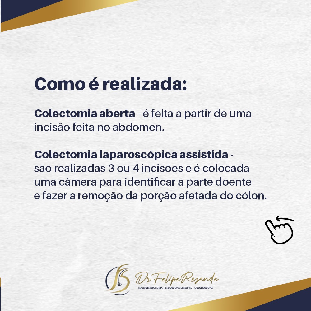 A colectomia trata-se de um procedimento cirúrgico de grande porte onde é realizada a retirada de parte ou de todo o intestino grosso e, apesar de ser uma cirurgia bastante invasiva, é a forma de tratamento mais eficiente e indicada no tratamento do câncer colorretal.