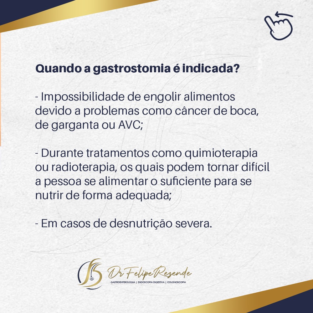 O procedimento é indicado quando o paciente, por algum motivo não pode, ou não consegue, se alimentar da maneira convencional, e é indicado principalmente quando é necessário interromper a alimentação via oral por um tempo mais prolongado.