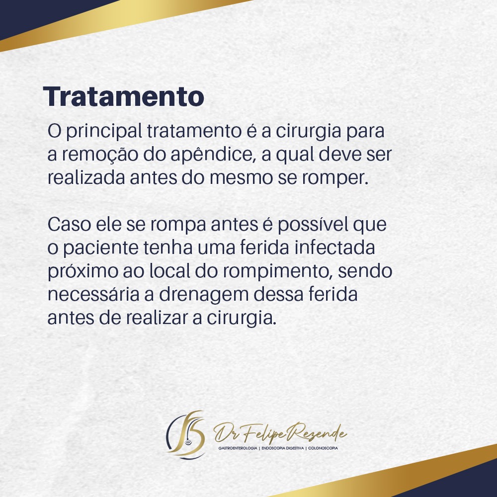 É muito importante que o tratamento seja realizado o quanto antes, visto que, quando inflamado o apêndice pode se romper, gerando uma infecção que pode se espalhar pela região do abdome, a qual pode ter consequências fatais.