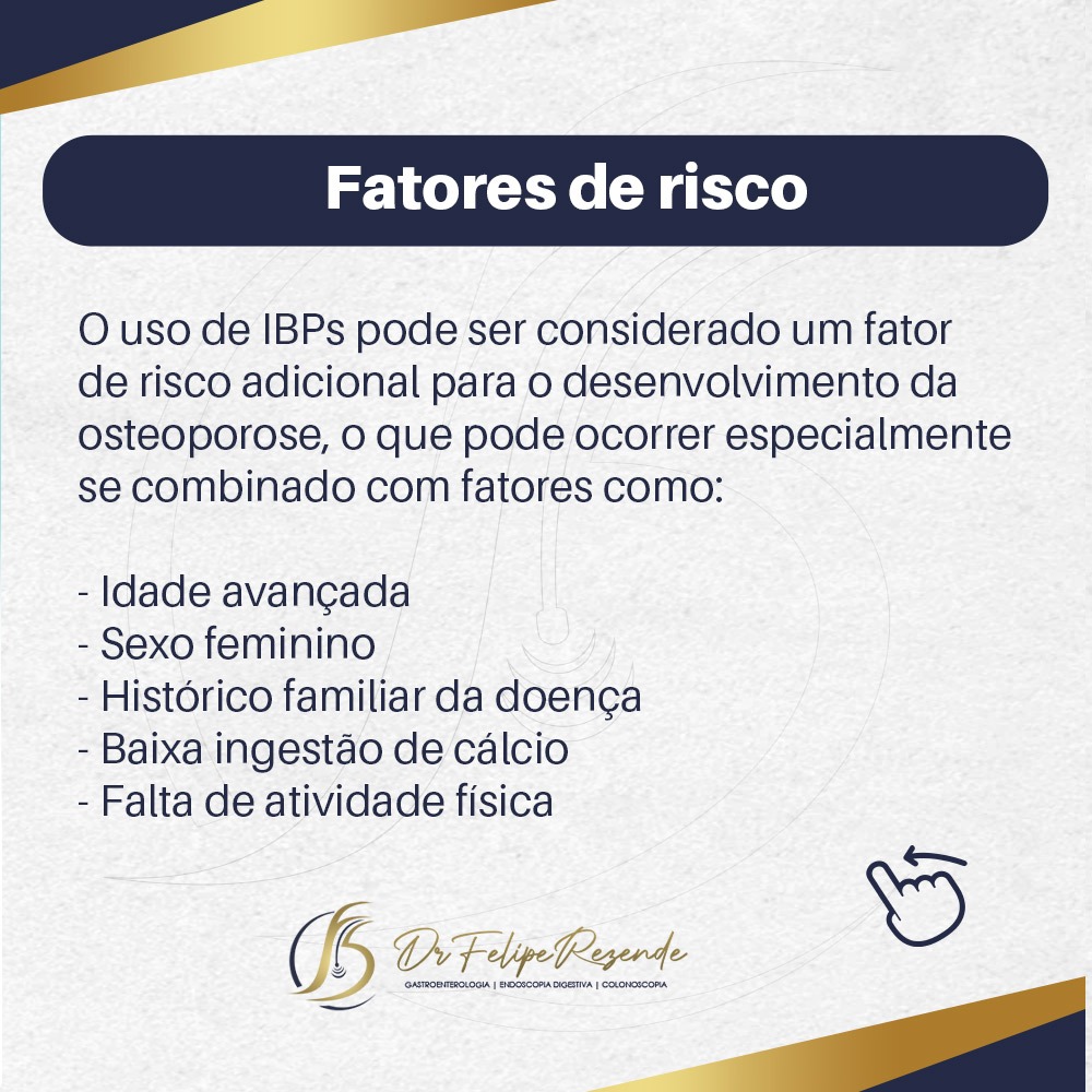 A relação entre o uso prolongado de inibidores de bomba de prótons (IBPs) e o aumento do risco de desenvolver osteoporose se tornou um motivo de preocupação nos últimos tempos. Uma revisão sistemática publicada no Journal of Clinical Endocrinology & Metabolism em 2019 analisou 13 estudos observacionais e concluiu que o uso de IBPs está ligado um pouco aumentado de fraturas ósseas quando comparados com pessoas que não fazem uso desses medicamentos, especialmente quando são utilizados em doses mais altas ou em longo prazo.