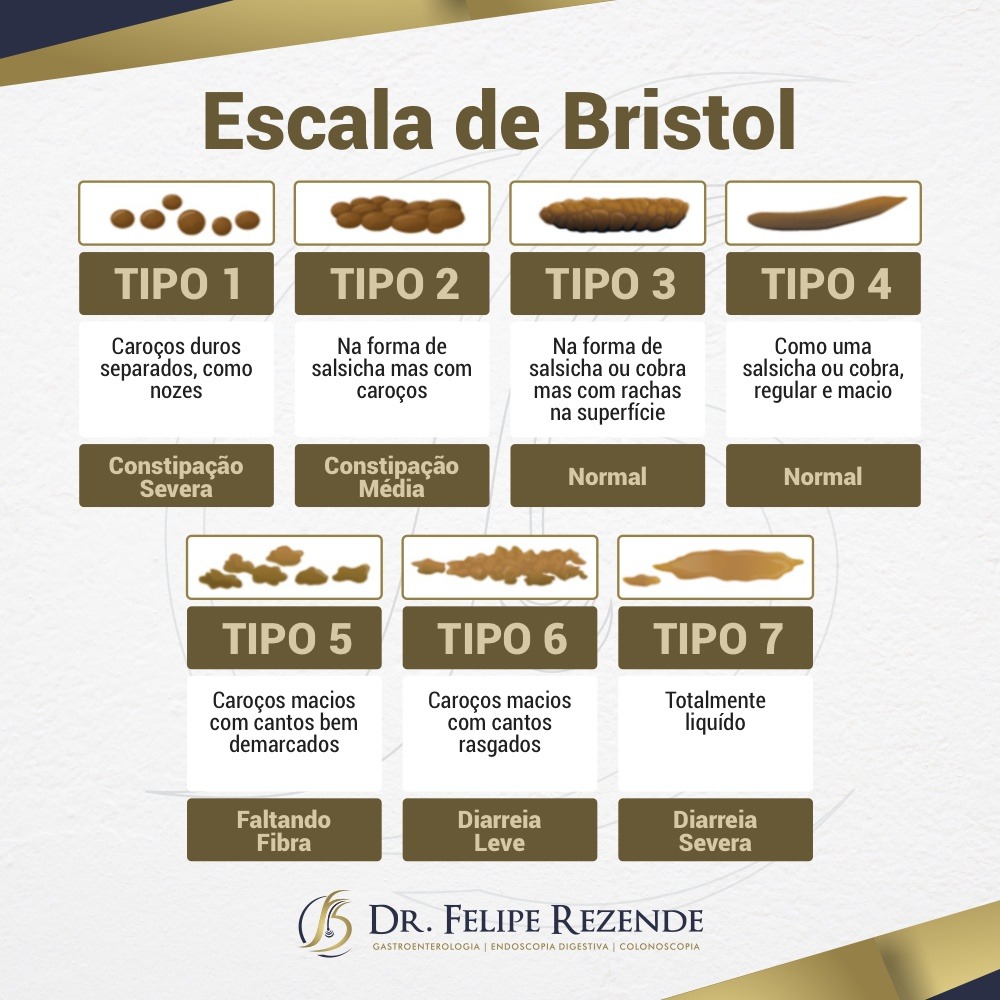 E para ajudar o paciente na hora de relatar essa questão do aspecto das fezes (o que é essencial para auxiliar no diagnóstico) os médicos utilizam a Escala de Britol, a qual você pode conferir arrastando para lado.
