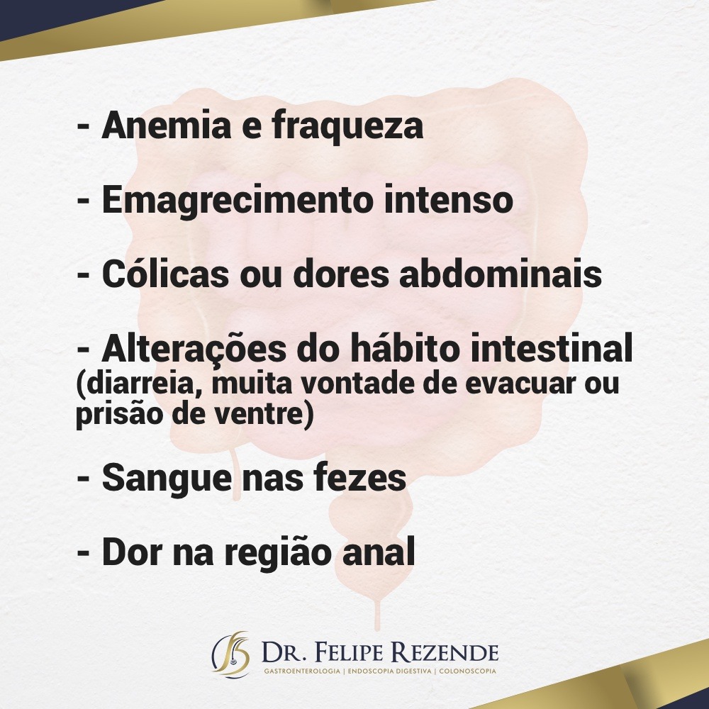 Realizar o exame de colonoscopia de forma preventiva a partir dos 45 anos é essencial para o diagnóstico precoce da doença, além disso, é preciso estar atento aos principais sintomas apresentados por quem possui esse tipo de tumor. Confira na segunda imagem quais são esses sintomas.